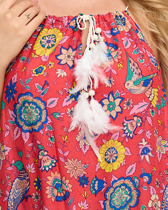 - Női ruha típusú köpeny puha és légies viszkóz anyagból. A modell nyakkivágása tollal díszített, fonott zsinórral van megkötve. MEGJEGYZÉS: A mérési pontosság (+/-) 1 cm.