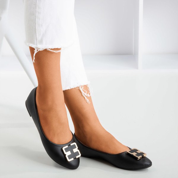 - Ökológiai bőrből készült, lapos sarkú női fekete balerinák. A mandula orrára varrt arany dísz. Megjegyzés: a termék anyagán ragasztónyomok vannak.