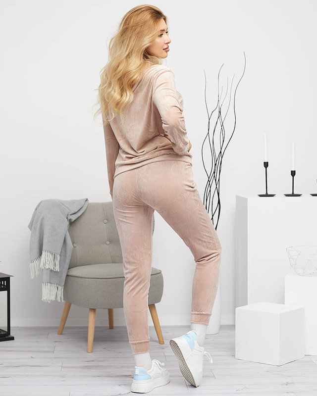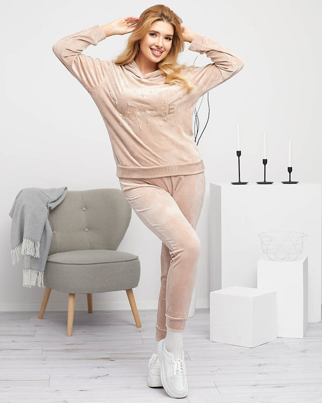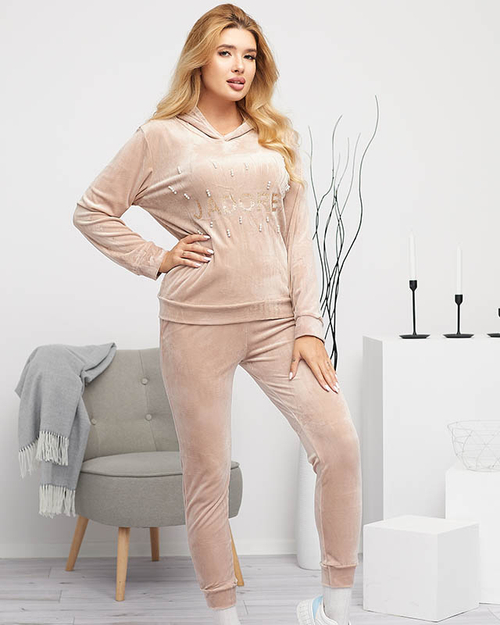 Bézs színű női tréningruha szett nyomattal és gyöngyökkel - Ruházat