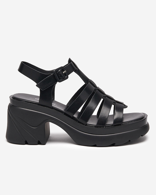 • Női szandál vastag sarkú, mint egy oszlop, ökológiai bőrből. A modell csattal van rögzítve a bokán, szögletes orrú. Megjegyzés: a termék anyagán karcolások találhatók.