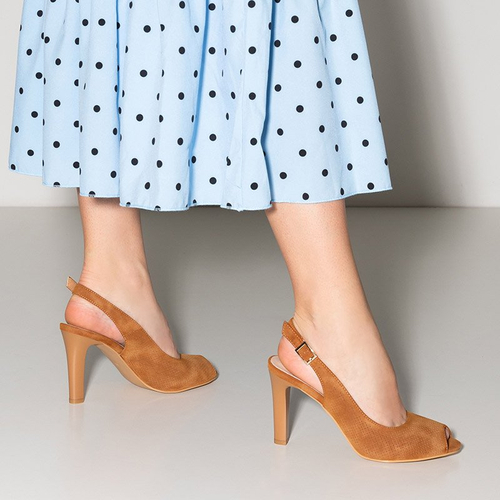 - Női szandál magas, keskeny oszlopon. A felsőrész nubukból készült áttört díszítéssel, a talpbetét pedig természetes bőrből készült. Megjegyzés: a termék anyagán ragasztónyomok vannak.