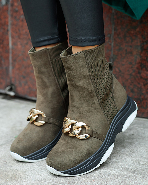 • Női csúszós csizma gumitalppal, puha öko-szarvasbőrből. Középen puha szőrmével szigetelt. A pár oldalán rugalmas betétekkel rendelkezik. A felsőrész aranyszínű lánccal díszített. ZÖLD SZIGETELT NŐI CSIZMA CUZITTA