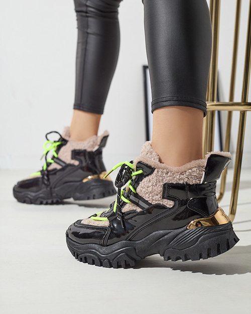 Fekete női sportcipő szőrmével és neonsárga fűzővel Adbo- Footwear