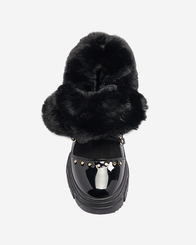 - Meleg női hócsizma vastagabb talppal, velúr és lakkbőr kombinációjából. Fűzős felsőrész, a cipő közepe és a felsőrész szőrmével szigetelt. Az orrán dekoratív strasszkövek. FEKETE TÉLI CSIZMA NŐI HÓCSIZMA FENTES