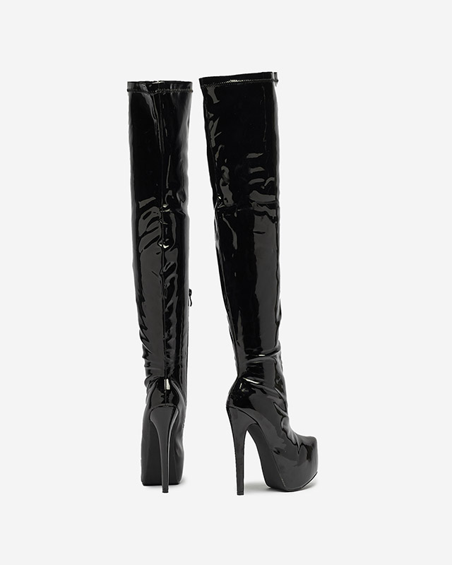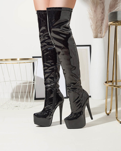 Női lakkozott térd fölé érő csizma fekete színben Leccie- Footwear