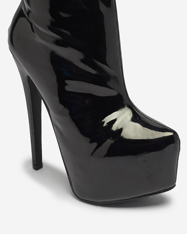 - Elegáns tűsarkú és platformos csizma lakkozott ökobőrből. Öko bőr talpbetét. Középen puha szőrmével töltött. Térdig érő modell, a vádli közepéig cipzárral záródó. FEKETE NŐI CSIZMA CSIZMA LECCIE