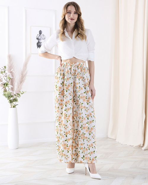 - Tavaszi női szövetnadrág, kellemes anyagból. A modellnek rugalmas pántja van, a derékon és a széles lábakon megkötővel. MEGJEGYZÉS: A mérési pontosság (+/-) 1 cm.