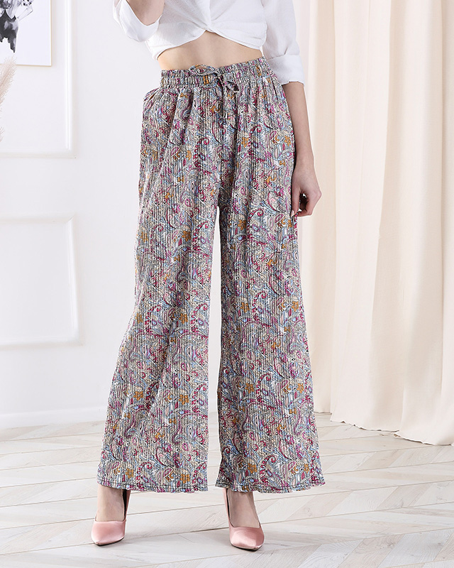 - Széles szárú szövetnadrág széles szárral. A modell könnyű és légies anyagból készült, derékrészén elasztikus pánttal és nadrággal. A nadrágot színes nyomtatás díszíti. Tökéletes a nyárra! MEGJEGYZÉS: A mérési pontosság (+/-) 1 cm.