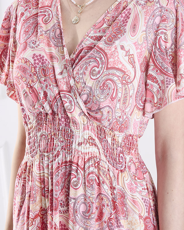 - Elegáns női ruha, puha és légies anyagból, érdekes mintával. A modell borítékolt nyakkivágással, elasztikus derékrésszel és rövid ujjakkal rendelkezik. Nagyszerű választás nyárra! MEGJEGYZÉS: A mérési pontosság (+/-) 1 cm.