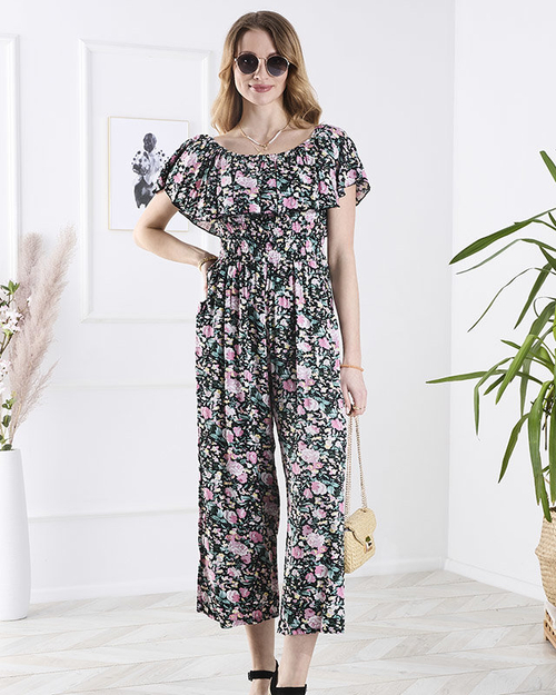 Fekete és rózsaszín hosszú, virágmintás női kezeslábas - Ruházat