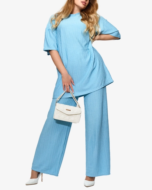 - Női szett sztreccs bordás anyagból. Blúz rövid ujjakkal és kerek nyakkivágással. Hosszú palazzónadrág magas derékkal, rugalmas pánttal és derékszíjjal. Stílusos és kényelmes kombináció! MEGJEGYZÉS: A mérési pontosság (+/-) 1 cm.