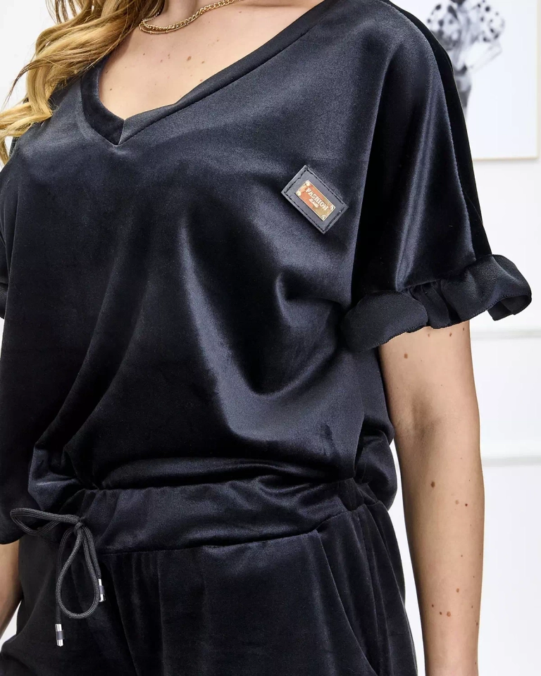 - Női tréningruha szett díszítéssel, puha anyagból a'la velúr. A blúz mély szívkivágással, rövid ujjú, fodros fodrokkal. A nadrág széles elasztikus pánttal és derékban megkötött megkötővel. Mérési pontosság (+/-) 1 cm.