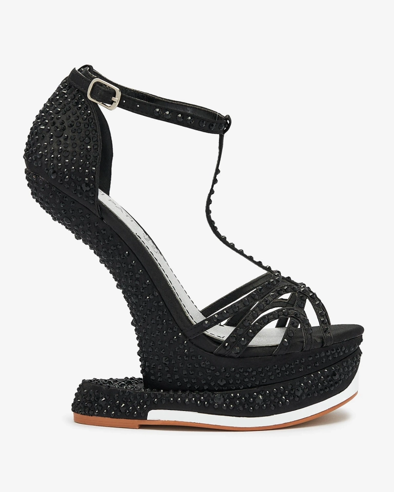 • Egyedi női pumpsok anyagból készültek, természetes bőr talppal. A modellt cirkóniával díszítették, platformmal és rejtett magassarkúval rendelkezik. A cipőt egy csat segítségével rögzítik a boka körül.