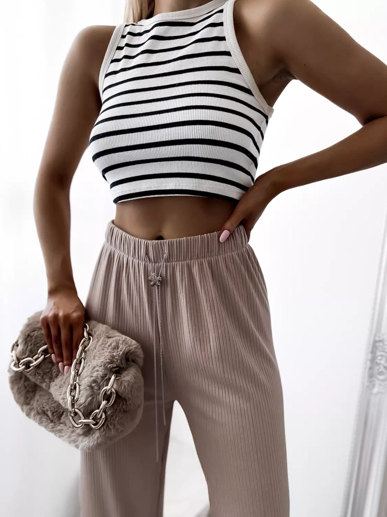 • Könnyű női bordázott anyagból készült bő nadrág. A termék rugalmas derékkal és nadrággal rendelkezik, amely tökéletesen kiemeli a derekat. Az idei szezon kötelező darabja! MEGJEGYZÉS: A mérési pontosság (+/-) 1 cm.