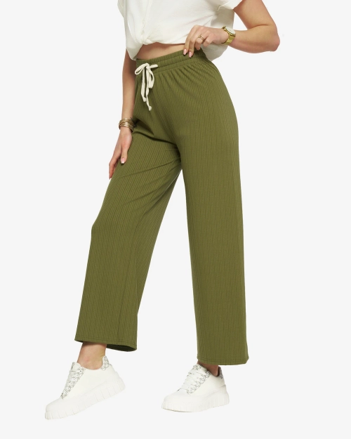- Női széles szárú bordázott nadrág szellős anyagból. A modell rugalmas derékpánttal, ezen kívül megkötővel és két zsebbel rendelkezik. Tökéletes tavaszi öltözékek összeállításához! MEGJEGYZÉS: A mérési pontosság (+/-) 1 cm.
