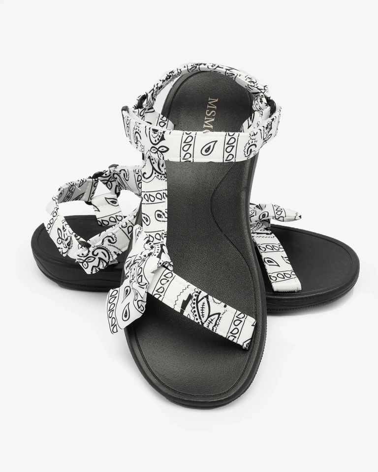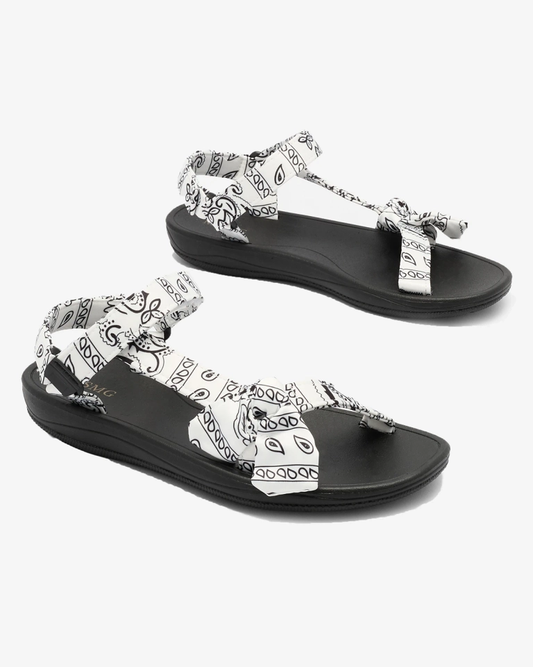 • Sportos női szandál gumitalppal. A pántok szövet anyagból készültek, nyomtatott mintával és masnival díszítve. A bemutatott női cipő tépőzáras pántokkal rögzíthető. Jól tapadnak a lábfejhez!
