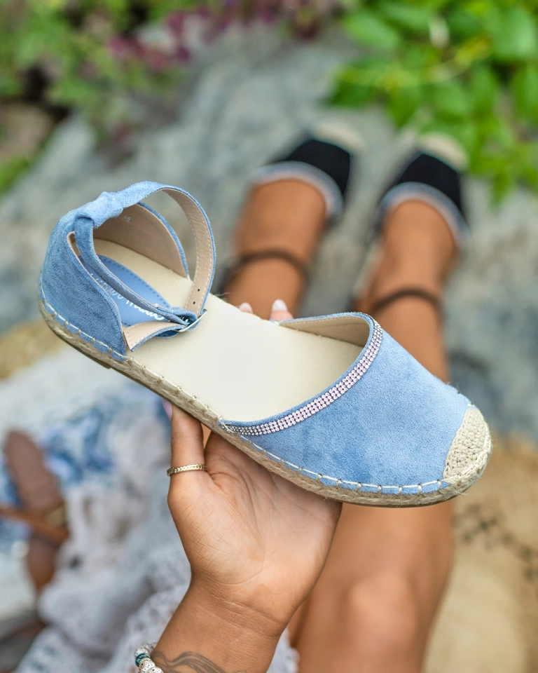 - Egyedi női espadrilles öko-szarvasbőrből, szövet talppal. Lapos talpa juta zsinórral díszített a kényelem érdekében. Csattal rögzíthető és feltűnő cirkonokkal díszített. Tökéletes a nyári stílushoz, csillogást és eleganciát kölcsönözve.