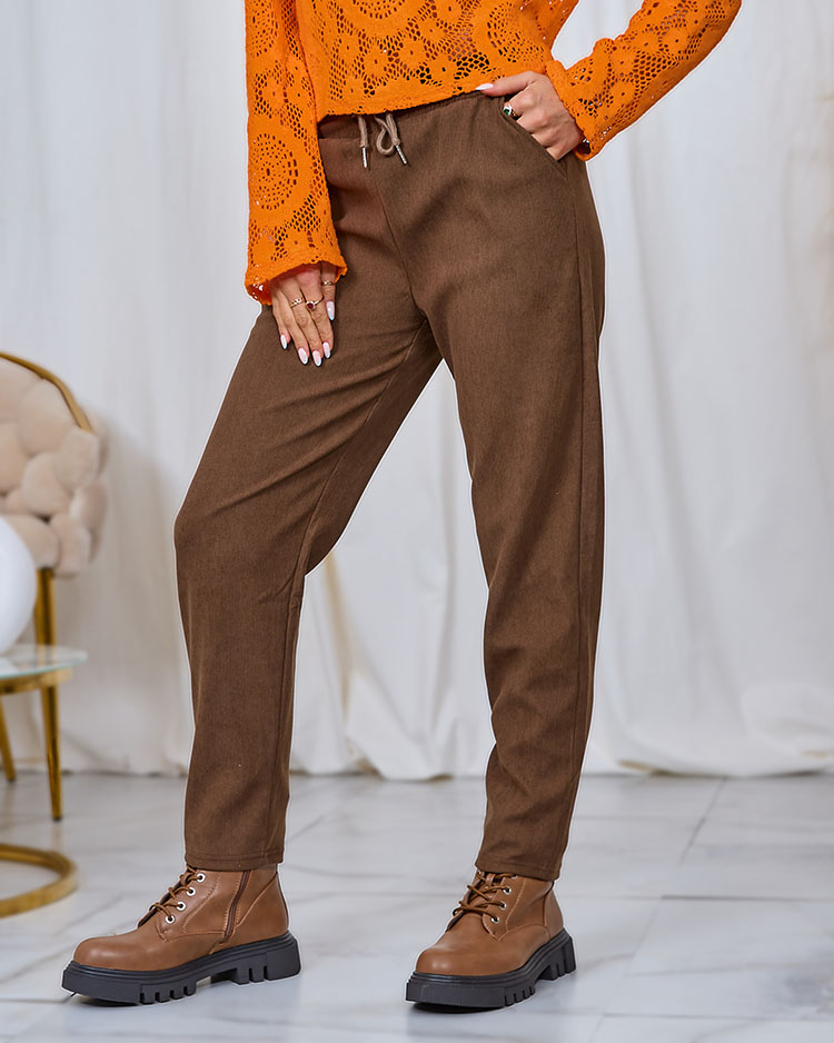 - Szenzációs egyenes női nadrág kord anyagból. A modell rugalmas derékpánttal rendelkezik, állítható megkötőkkel. Ezen kívül két csúszózsebbel az elején. Tökéletes a stílusos öltözékek összeállításához!