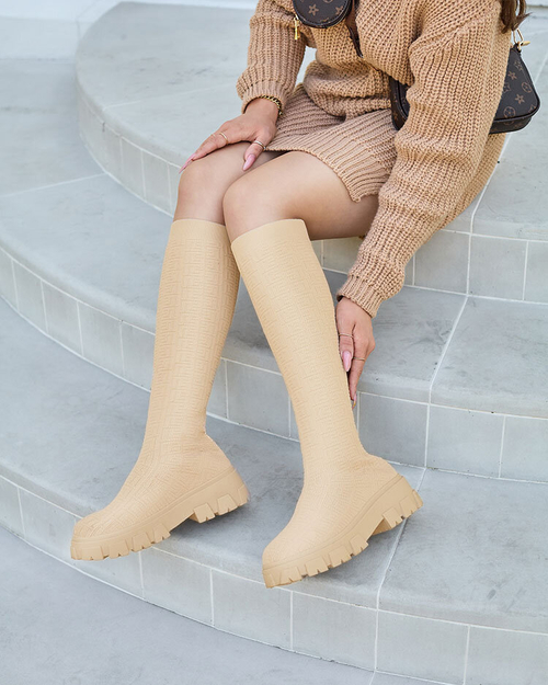 - Egyedi női térdig érő szövetcsizma. Slip-on modell, rugalmas szövetből készült, érdekes mintával díszített, ami stílust ad nekik. Belül szövet talpbetét található. Az idei szezon slágere!