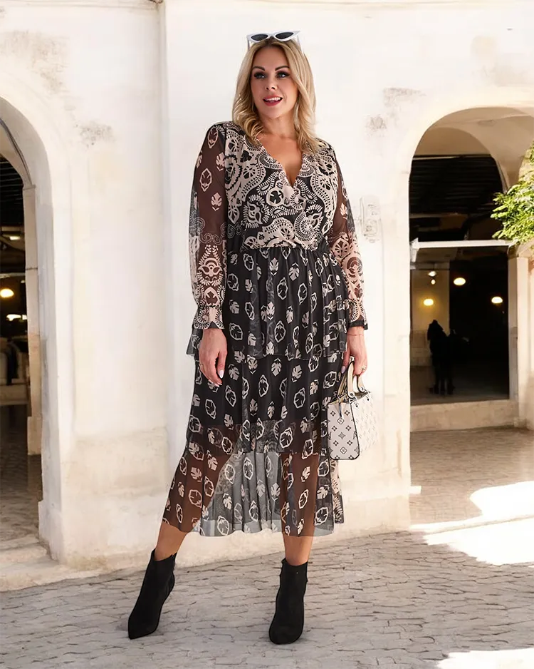 - Női midi ruha nyomtatással, bélelt, áttetsző anyagból készült a'la mesh. Modell hosszú ujjakkal és szív alakú nyakkivágással, elasztikus derékpánttal. Tökéletes a mindennapi viselethez!