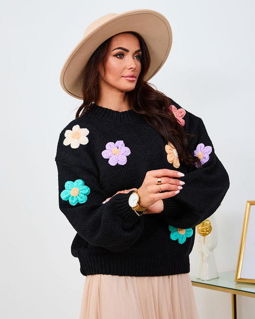 - Ez az egyedi pulóver a kényelem és a báj esszenciája. A puha anyagból készült pulóver kerek nyakkivágással és hosszú ujjakkal rendelkezik. Színes virágok teszik egyedivé a báját!