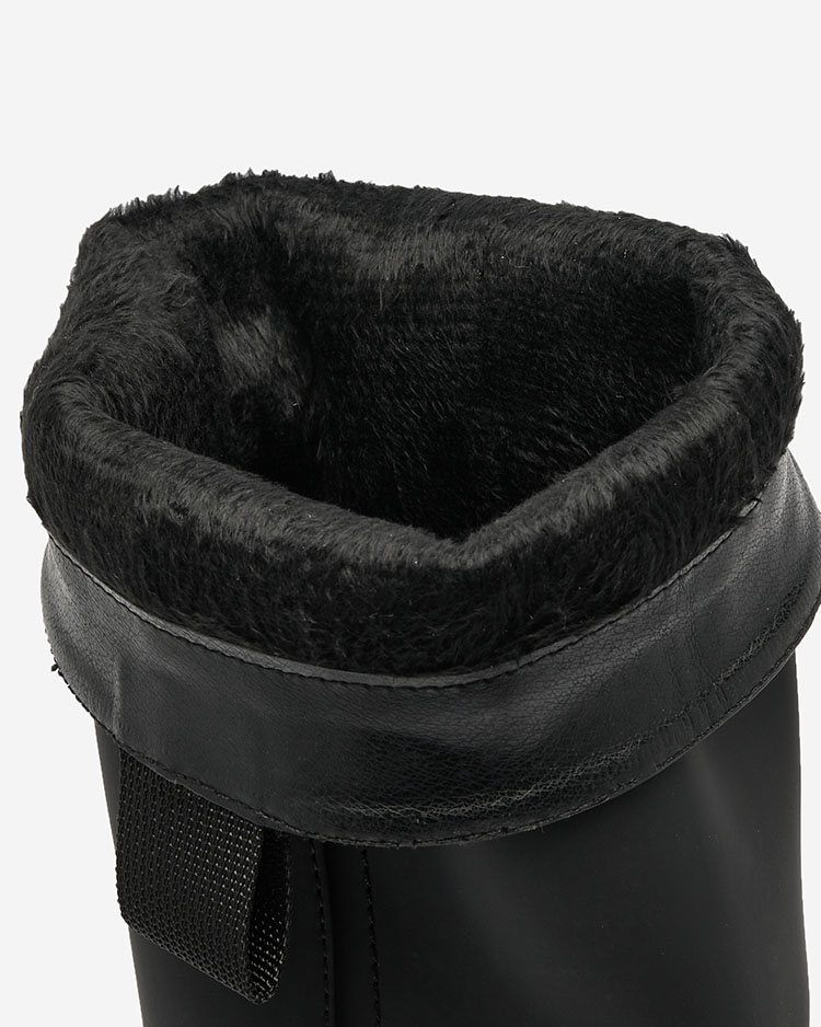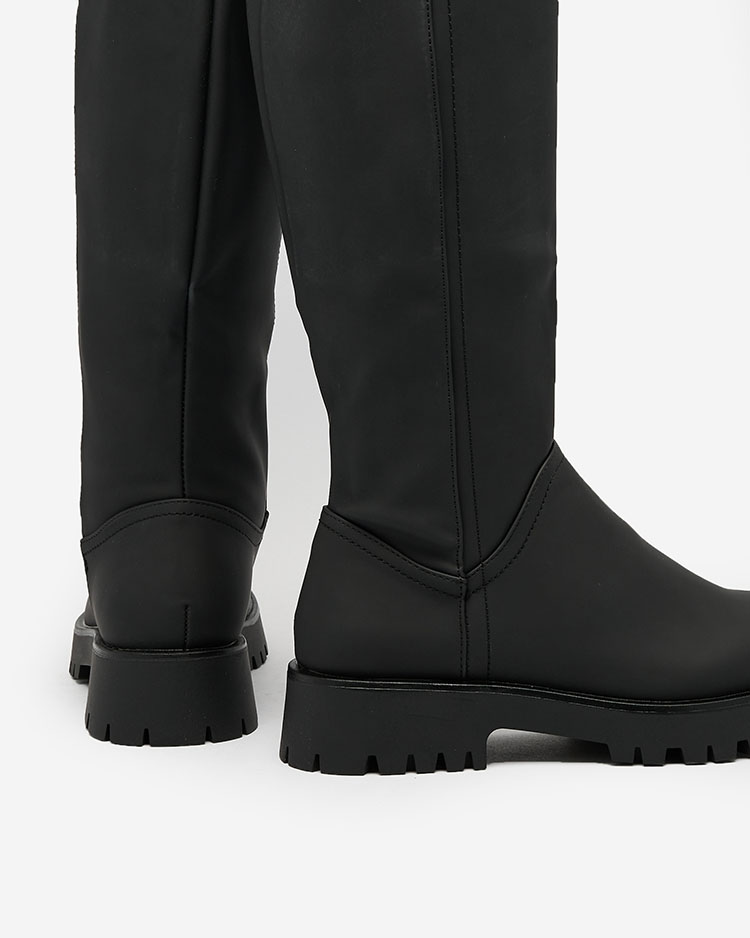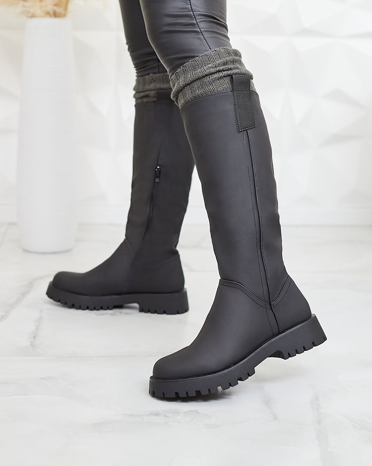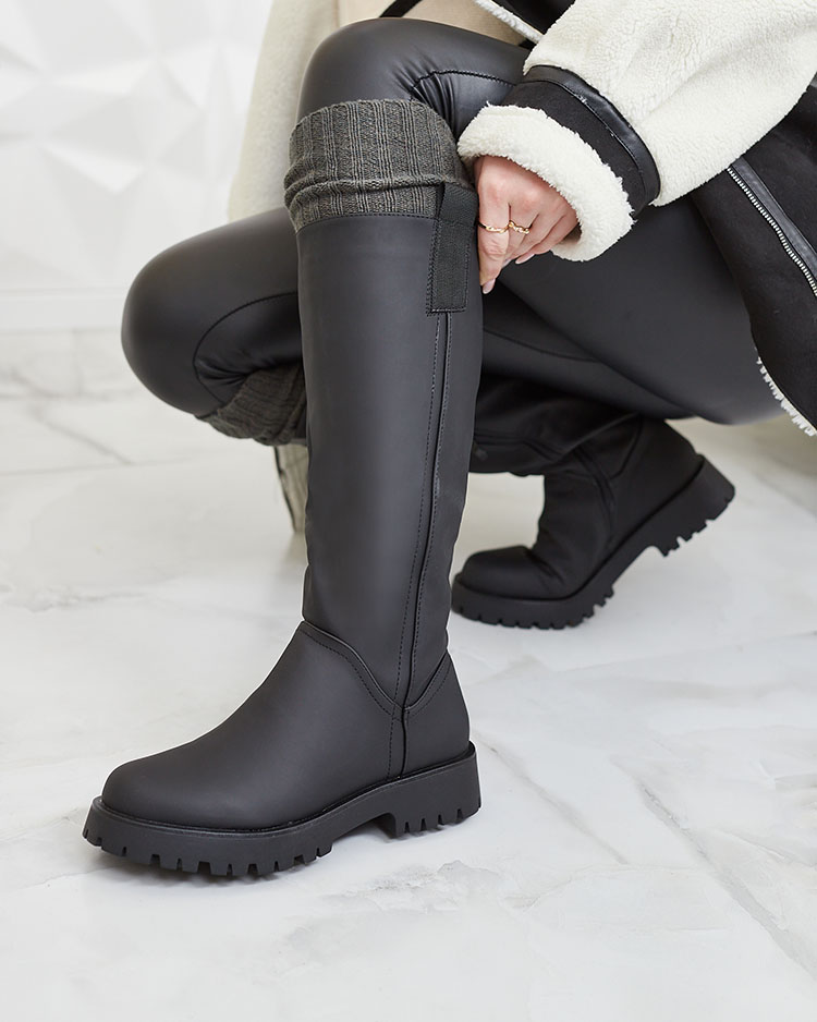 - Női térdig érő csizma, matt eco bőrből. A modell lapos sarkú és puha szőrme szegéllyel rendelkezik. A lábbeli felsliccelhető, és a lábszár közepén cipzárral záródik.
