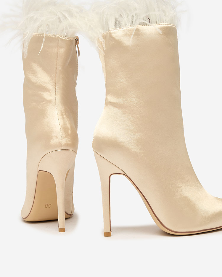 - Elegáns tűsarkú csizma szövet a'la satinból. Az orr hegyes csúcsban végződik. Oldalán cipzár és tollak formájában díszítés a felsőrész végén. Nagyszerű cipő az őszi kreációkhoz!