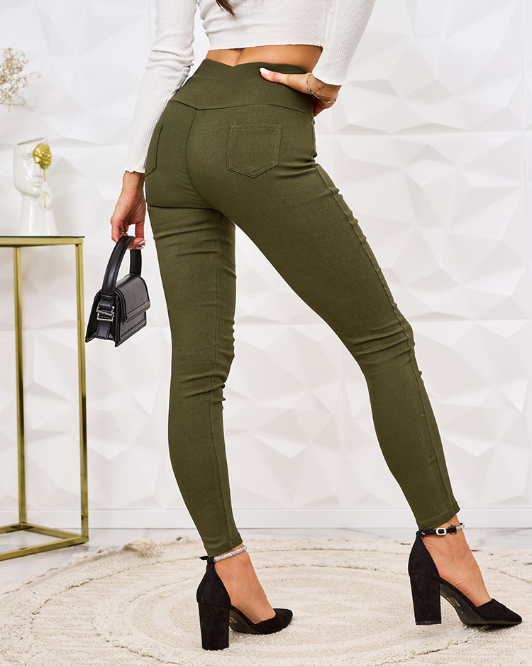 • Időtlen női teggings nadrág, sztreccs anyagból. A modell széles elasztikus derékszíjjal és hátul 2 csúszózsebbel rendelkezik. Gombkötéssel díszített. Tökéletes a mindennapi viselethez!