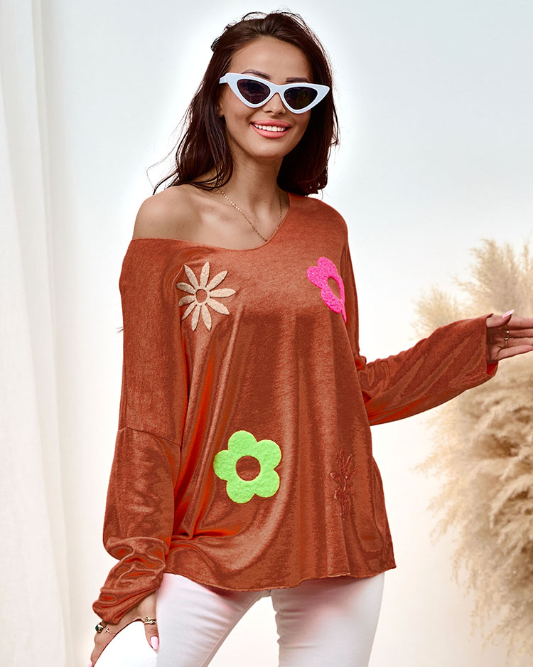 - Kellemes anyagból készült női pulóver szíves nyakkivágással. A modell hosszú ujjú és virág alakú foltokkal rendelkezik. Tökéletes alap a téli öltözékekhez!