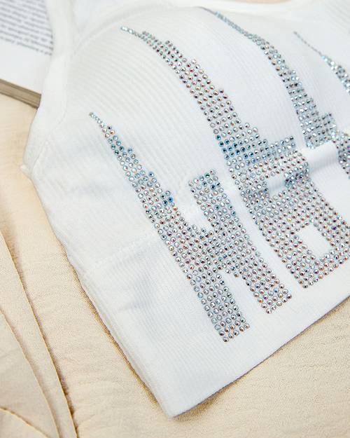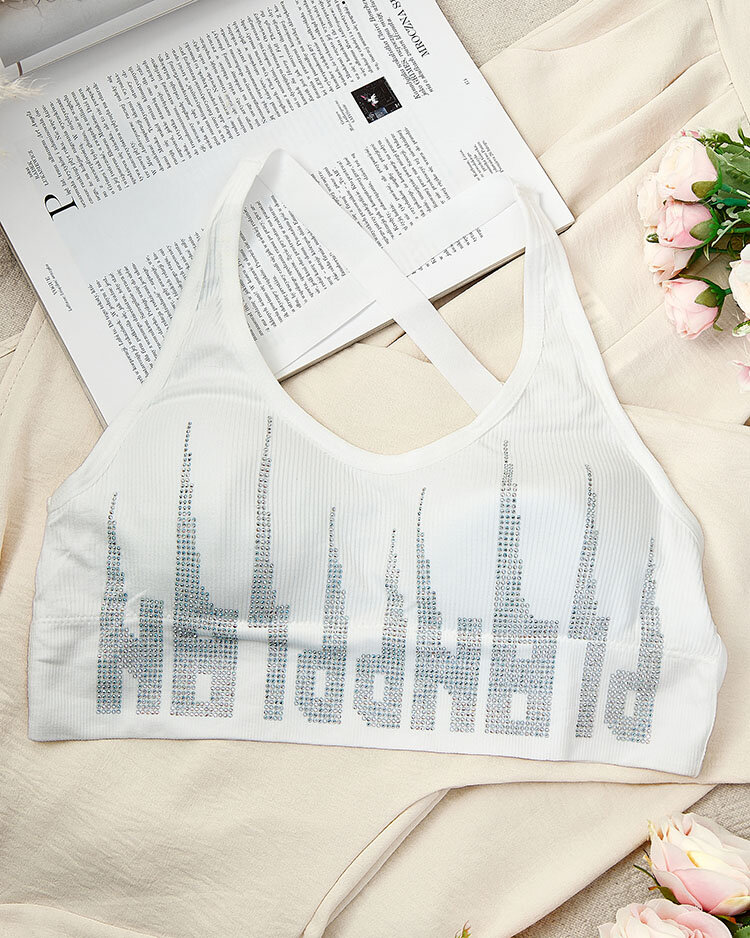 • Női sportmelltartó rugalmas, kellemes anyagból. Modell nem állítható, keresztbe tett pántokkal, kapcsok nélkül, kivehető betétekkel, alul széles gumival befejezve és cirkonokkal díszítve. Tökéletesen illeszkedik a testhez.