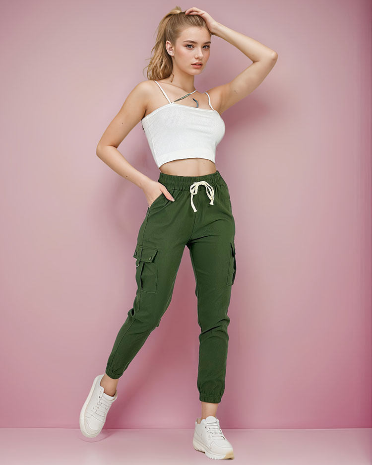- Kényelmes női harci nadrág kellemes anyagból. A modell 4 zsebbel rendelkezik, beleértve az oldalsó zsebeket is. A nadrág derékrészén rugalmas pánt és megkötő található.
