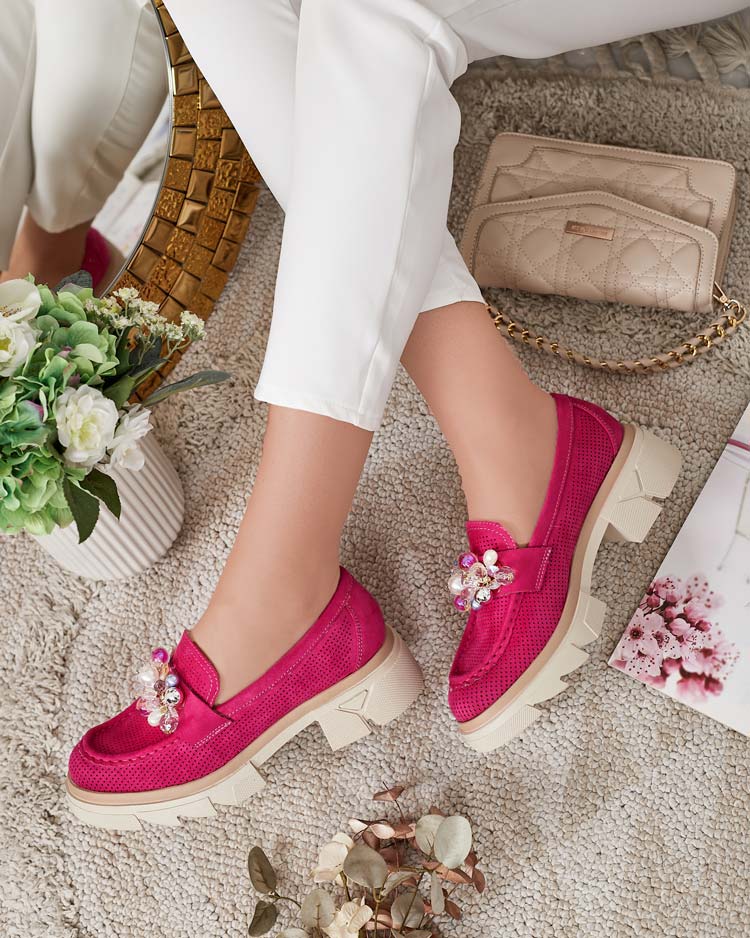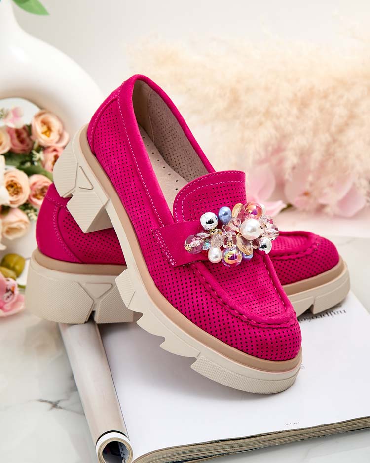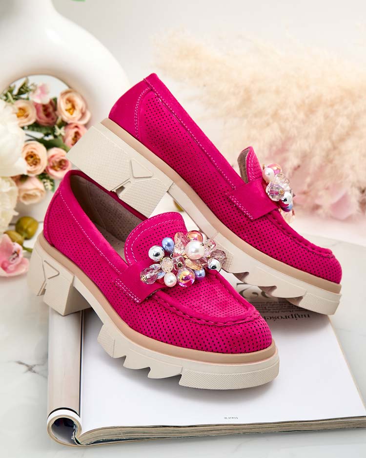 - Gyönyörű mokaszin egyszínű talppal a stílus és a kényelem kombinációja. Organikus velúrbőrből készült, áttört kivitelben. Talpbetétje természetes bőrből készült. A színes kristályokkal díszített orr hozzáad a rendkívüli csillogáshoz és bájhoz.