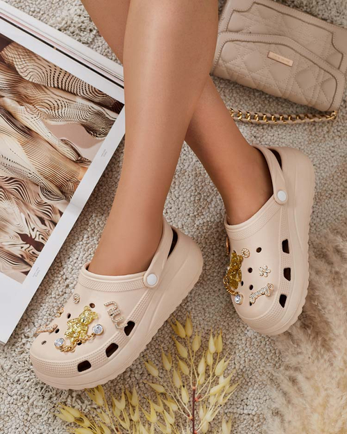 • Nagyszerű áttört női gumi flip-flop lapos talppal. Kivehető, cirkóniával díszített díszítéssel a felsőrészükön. Tökéletes választás a nyaralásokhoz!
