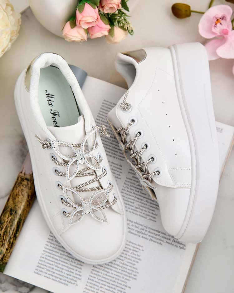• Eko bőr női tornacipő vastagabb talppal - a stílus és a kényelem tökéletes kombinációja. Fűzős modell, brokátos kivitelben pillangókkal. Ideális az aktív emberek számára!