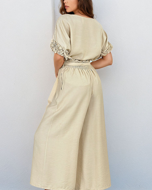 - Szövetszett nadrággal és rövid ujjú blúzzal, a végén fodorral. A nadrág rugalmas derékszíjjal, széles szárú, 2 zsebbel rendelkezik. MEGJEGYZÉS: A mérési pontosság (+/-) 1 cm.