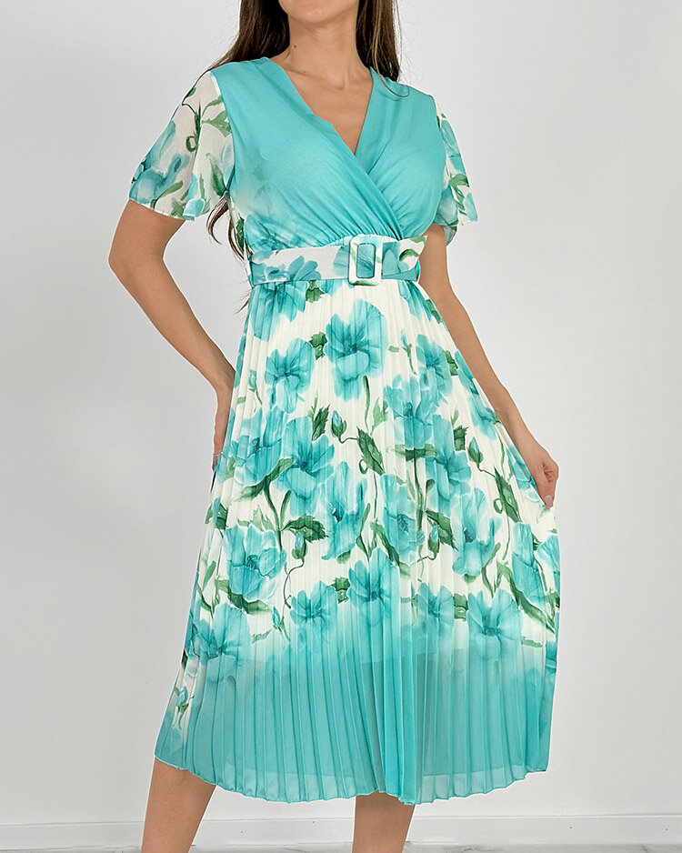 - Egyedi női ruha könnyű, virágos anyagból. A derék magasságában kiegészítő övvel rendelkezik. A midi hosszúságú termék rövid ujjakkal és pliszírozott szegéllyel rendelkezik. Érezd a nyarat ebben a modellben!