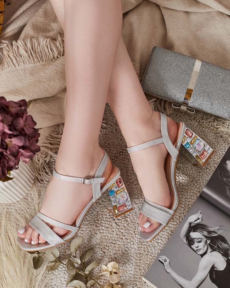 • Szövetborítású, csillámokkal kirakott szandál magas posztón, strasszos kövekkel, csattal rögzítve. Öko bőr talpbetét. A stílus és a kényelem keveréke. A tömör sarok magabiztosságot ad a lépéshez. Tökéletes bármilyen alkalomra!