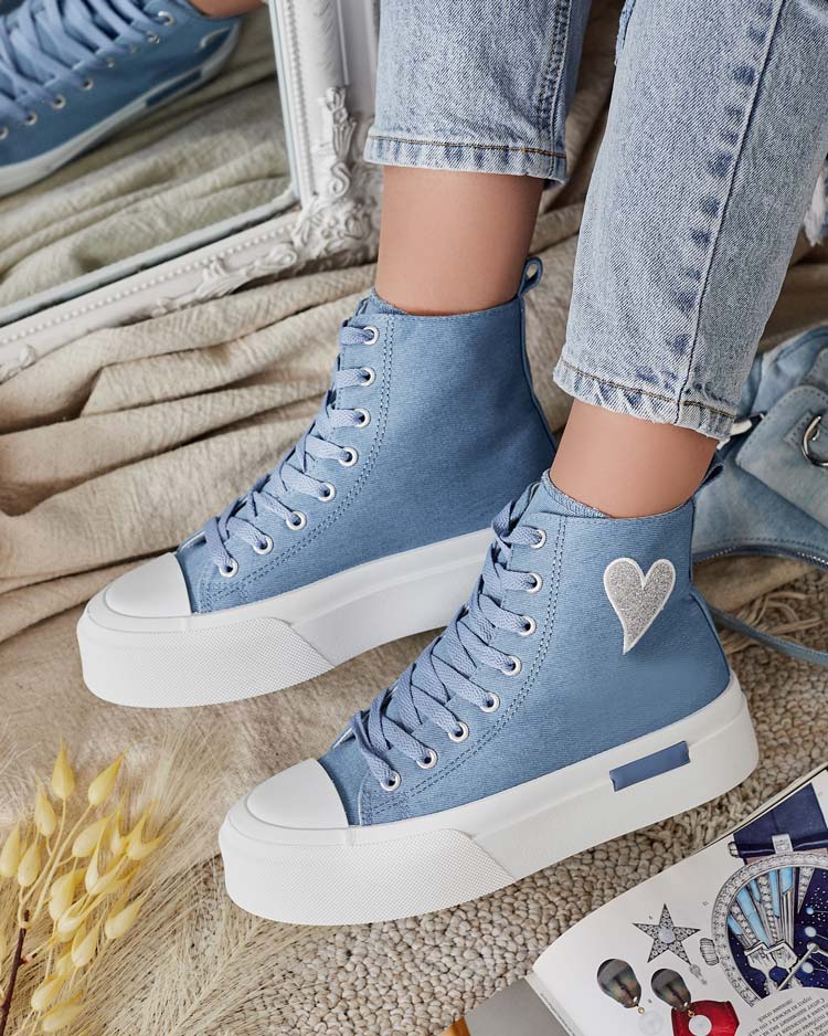 • Stílusos női sportcipő szövet anyagból, szív alakú díszítéssel. A modell kényelmes platformon áll. A felsőrész fűzős. Nagyszerű a mindennapi öltözékek megalkotásához!