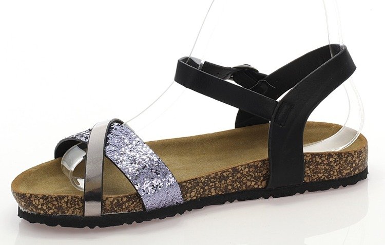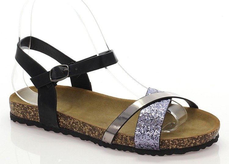 • Wygodne sandały wykonane z ekologicznej skóry. Przedni paseczek ozdobiony brokatem. Z boku sprzączka. Idealnie nadadzą się na cieplejsze dni.