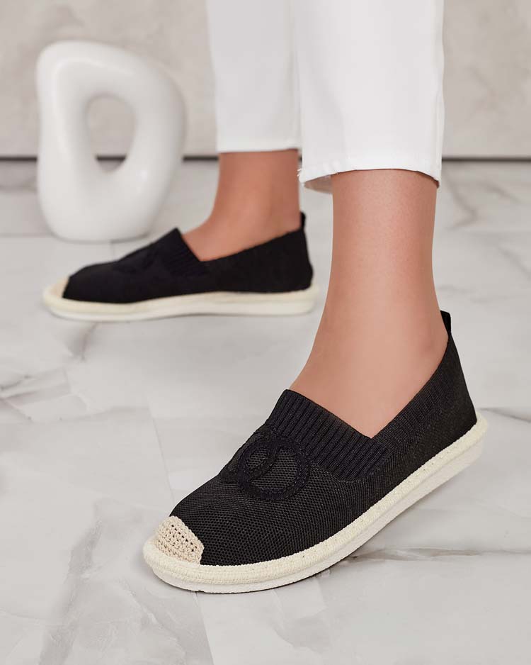 - Egyedi női espadrilles szövetből és szövet talpbetéttel. Jutazsinórral díszített lapos talp biztosítja a kényelmet. Slip-on modell. Tökéletes kiegészítője a nyári stílusoknak!
