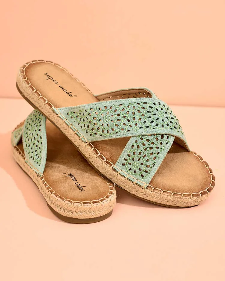 - Nagyszerű női lapos talpú flip-flop. A modell áttört, öko velúrbőrből készült, cirkonokkal díszített felsőrésszel és öko velúrbőr vonalzóval rendelkezik. A talp juta zsinórral körbetekerve. Tökéletes választás a nyaralásokhoz!