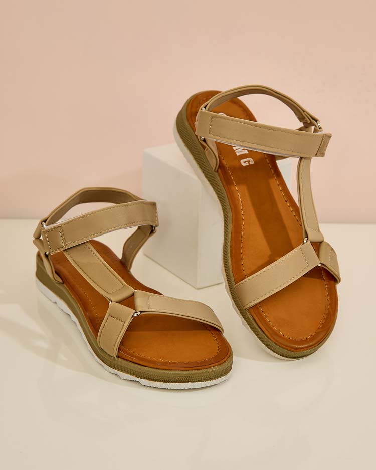 - Női szandál lapos díszes talppal. Kellemes anyagból készültek, a talpbetét öko bőr. Tépőzárral rögzíthető lábbeli. Tökéletes a divatos nyári öltözékek összeállításához!