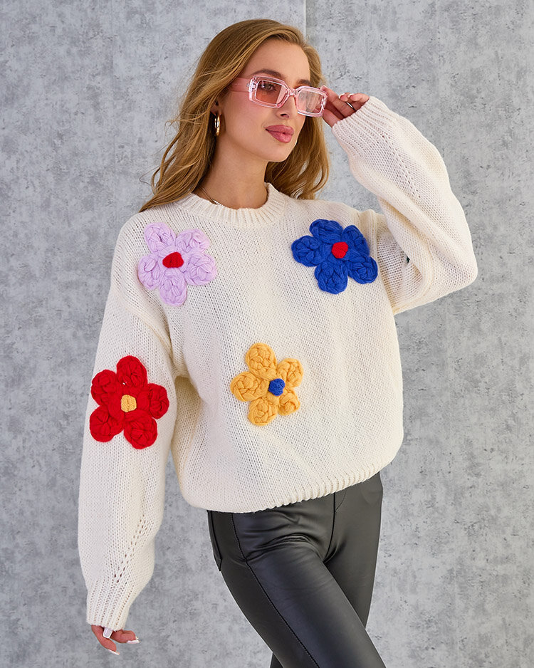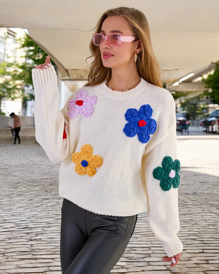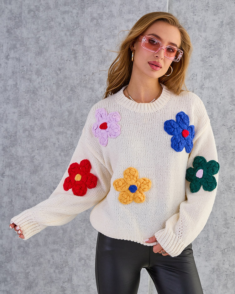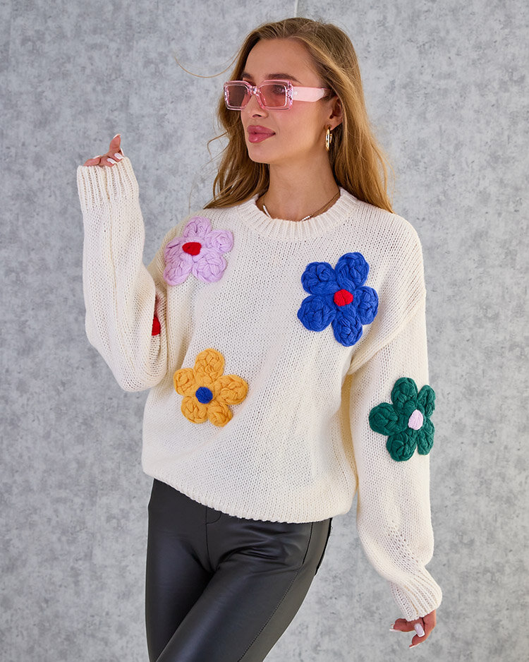 - Kellemes női pulóver kerek nyakkivágással . A modell hosszú ujjú és virág alakú foltokkal rendelkezik. Tökéletes alap az őszi öltözékekhez!
