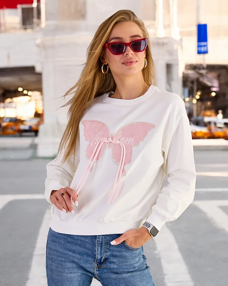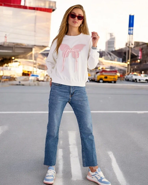 - Adj hangulatot az öltözékeidnek a vékonyabb, pillangófoltokkal díszített pulóverünkkel. A fej fölé húzható, kerek nyakkivágással és hosszú ujjakkal. Tökéletes minden napra, amikor lazán, mégis stílusosan szeretnéd érezni magad!