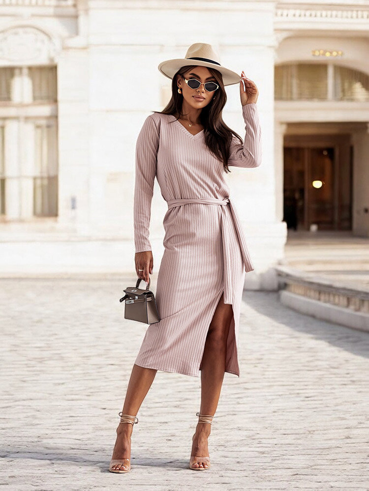 - Női félvállas ruha , hosszú ujjakkal és szív alakú nyakkivágással. A modell bordázott anyagból készült, és elegáns, combközépig érő hasítékkal rendelkezik. Ezen kívül egy öv is tartozik hozzá. Must have az idei szezonban! MEGJEGYZÉS: A mérési pontosság (+