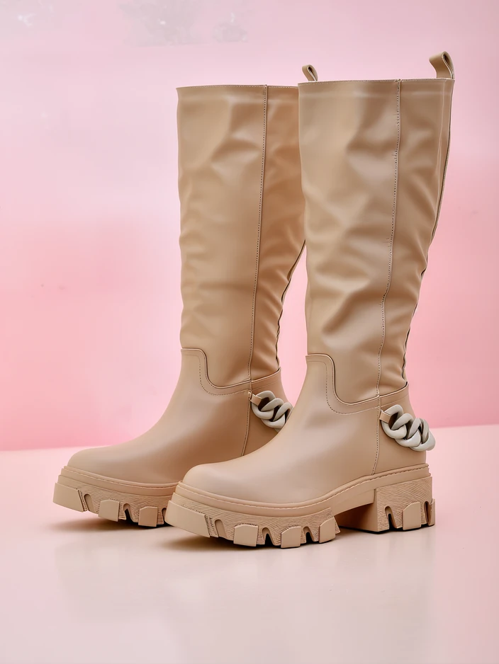 - Női térdig érő csizma, ökológiai bőrből. A modell lapos sarkú. A lábbeli felsliccelhető. Hátul nem eltávolítható díszítéssel rendelkeznek lánc formájában.