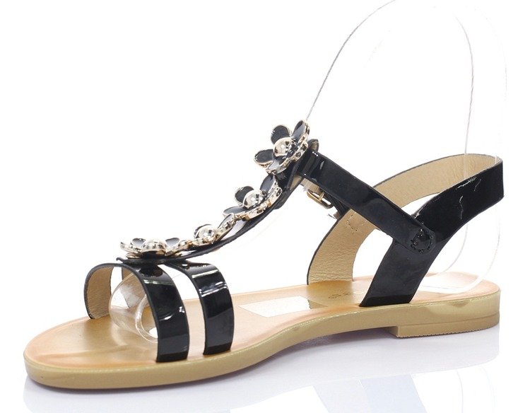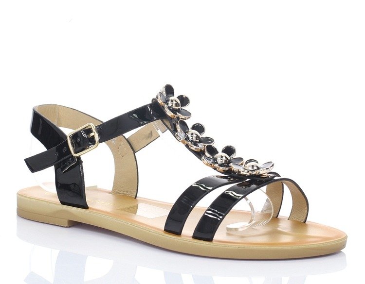 - Wygodne sandały damskie wykonane ze skóry ekologicznej. Posiadają ozdobne kwiatuszki na paseczku. Idealnie sprawdzą się na cieplejsze dni.