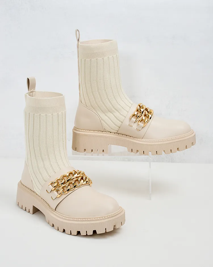 • Csizma lapos talppal - stílus és kényelem egyben. Slip-on modell, öko bőr és szövet kombinációjából készült, a talpbetét puha szőrme. Láncokkal díszített modell az orránál, magabiztosságot ad!