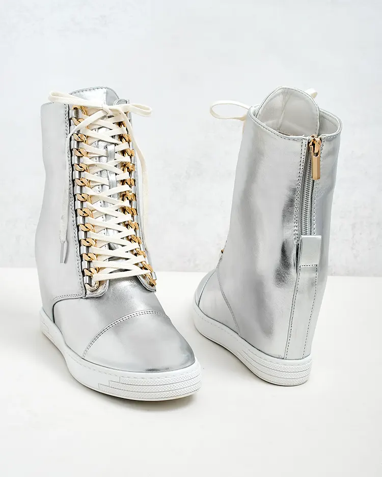 - Női sportos, ökológiai bőrből készült magassarkú csizma. A cipő fűzővel van megkötve és hátul cipzárral rendelkezik. Tökéletes a stílusos öltözékek összeállításához!