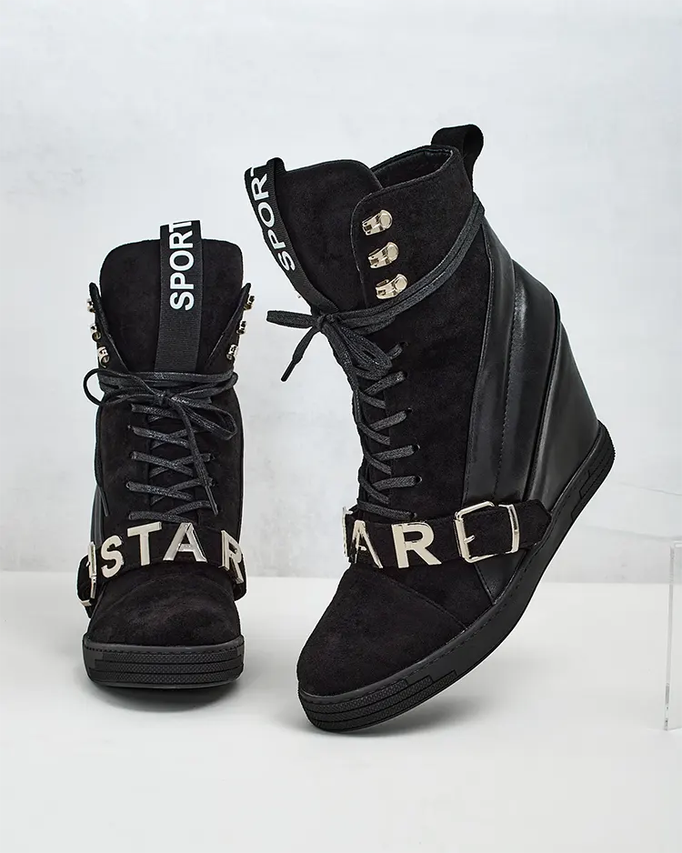 • Sportos női magassarkú csizma, amely öko-bőr és öko-szarvasbőr kombinációjából készült. Kötött cipő díszítéssel a felsőrészen, belül szövet talpbetéttel.